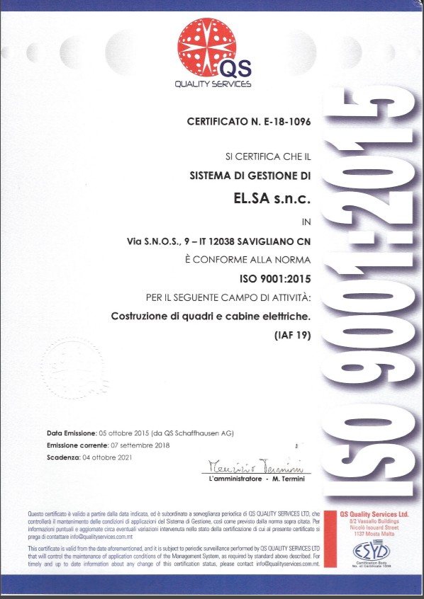È per questo che il principio fondamentale su cui si basa la Politica Qualità di EL.SA. è la soddisfazione delle esigenze del Cliente che si concretizza attraverso la produzione di cabine e quadri elettrici sicuri e nel rispetto delle leggi, dei regolamenti e delle normative attualmente in uso.