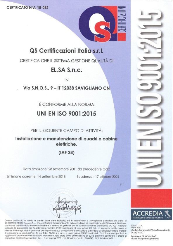 In conformità alle norme internazionali per la certificazione UNI EN ISO 9001:2015, finalizzate a migliorare la competitività attraverso certificazioni di efficacia, di efficienza e dichiarazioni dei plus competitivi, l’azienda EL.SA. snc è stata ritenuta idonea nei seguenti campi di applicazione: